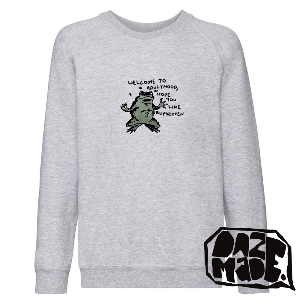 Welcome to adulthood, hope you like ibuprofen hand printed onto a heather grey jumper.