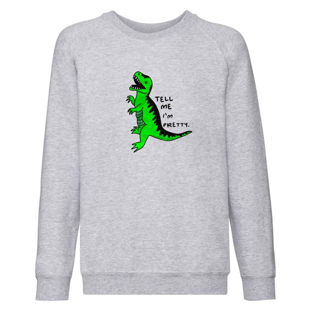 Tell me I’m pretty dinosaur hand printed onto a heather grey jumper.